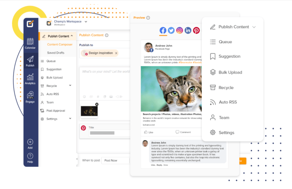 If you want to make social media a big part of your promotion efforts, Social Champ is your heavy hitter . It has has a great, easy-to-use interface that’ll help you publish on social media regularly, schedule your posts, and manage multiple accounts.