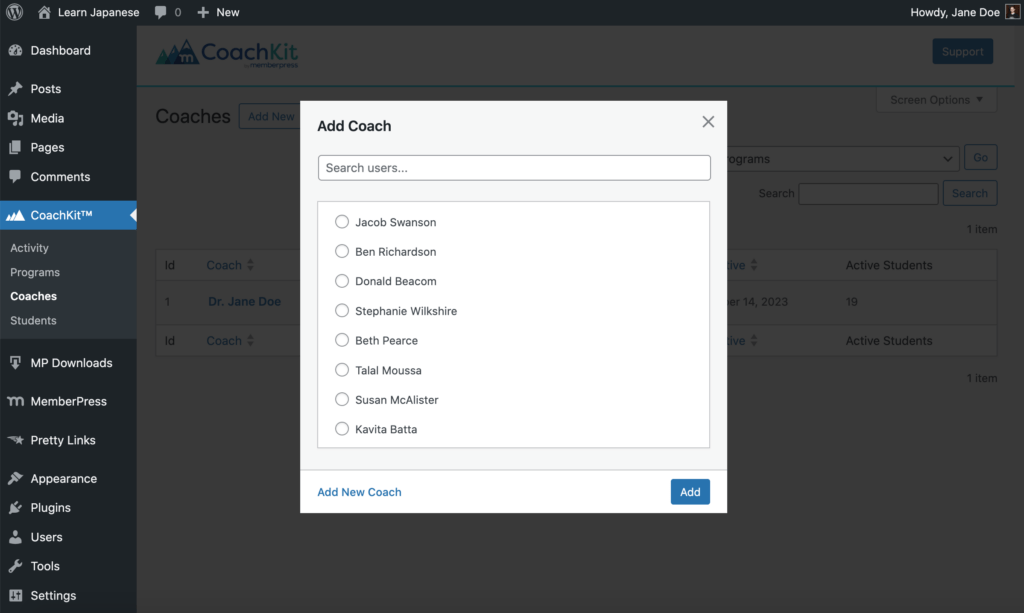 Seriously, you simply add your coaches right on your own WordPress website. Every coach goes to the same place to manage the program and students.