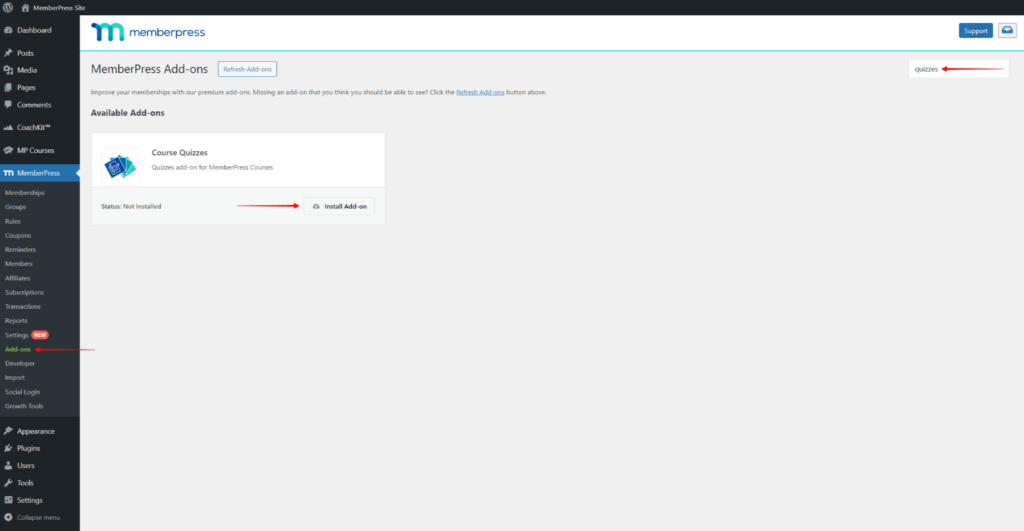 To enable it, head to your WordPress Dashboard > MemberPress > Add-ons.