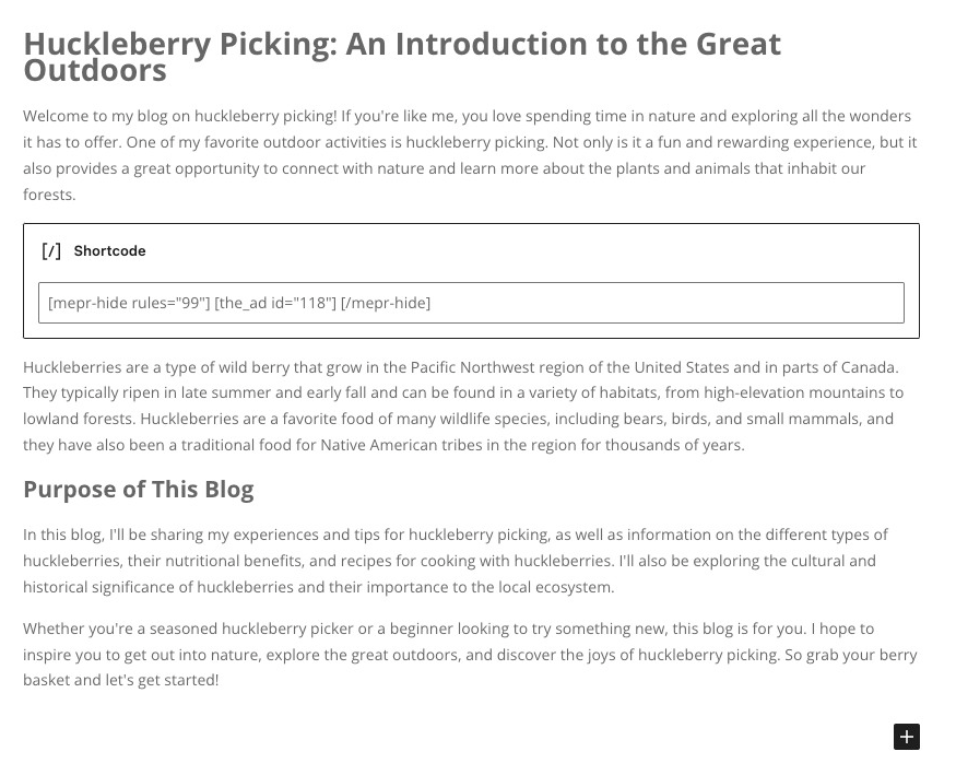 Place your ad shortcode wherever you want to serve ads. Then wrap it with the MemberPress Hide shortcode. Here’s what it looks like using an in-line ad spot between paragraphs in my fictitious blog.