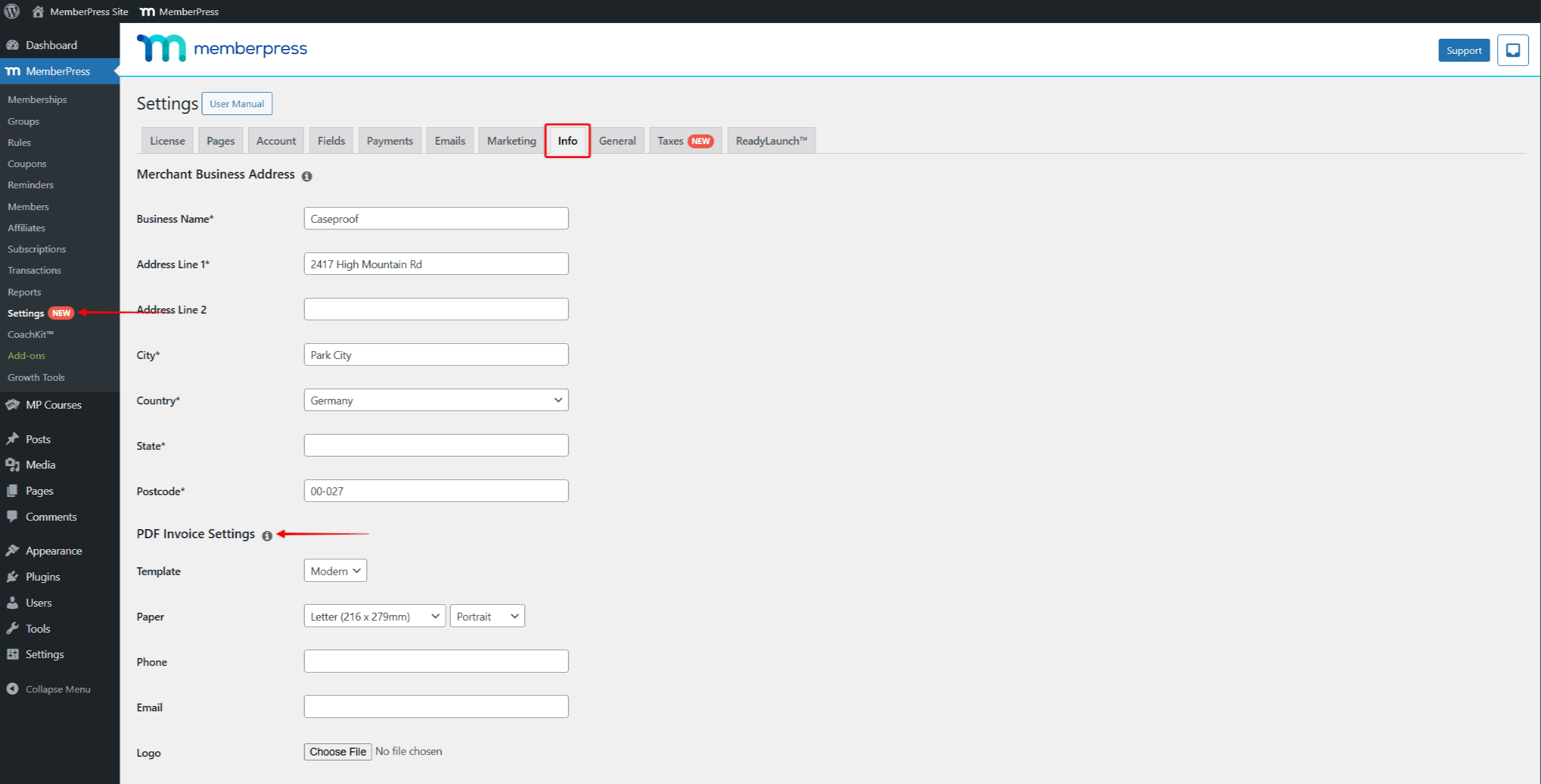 After installation, new invoice-related settings will become available in your MemberPress settings.