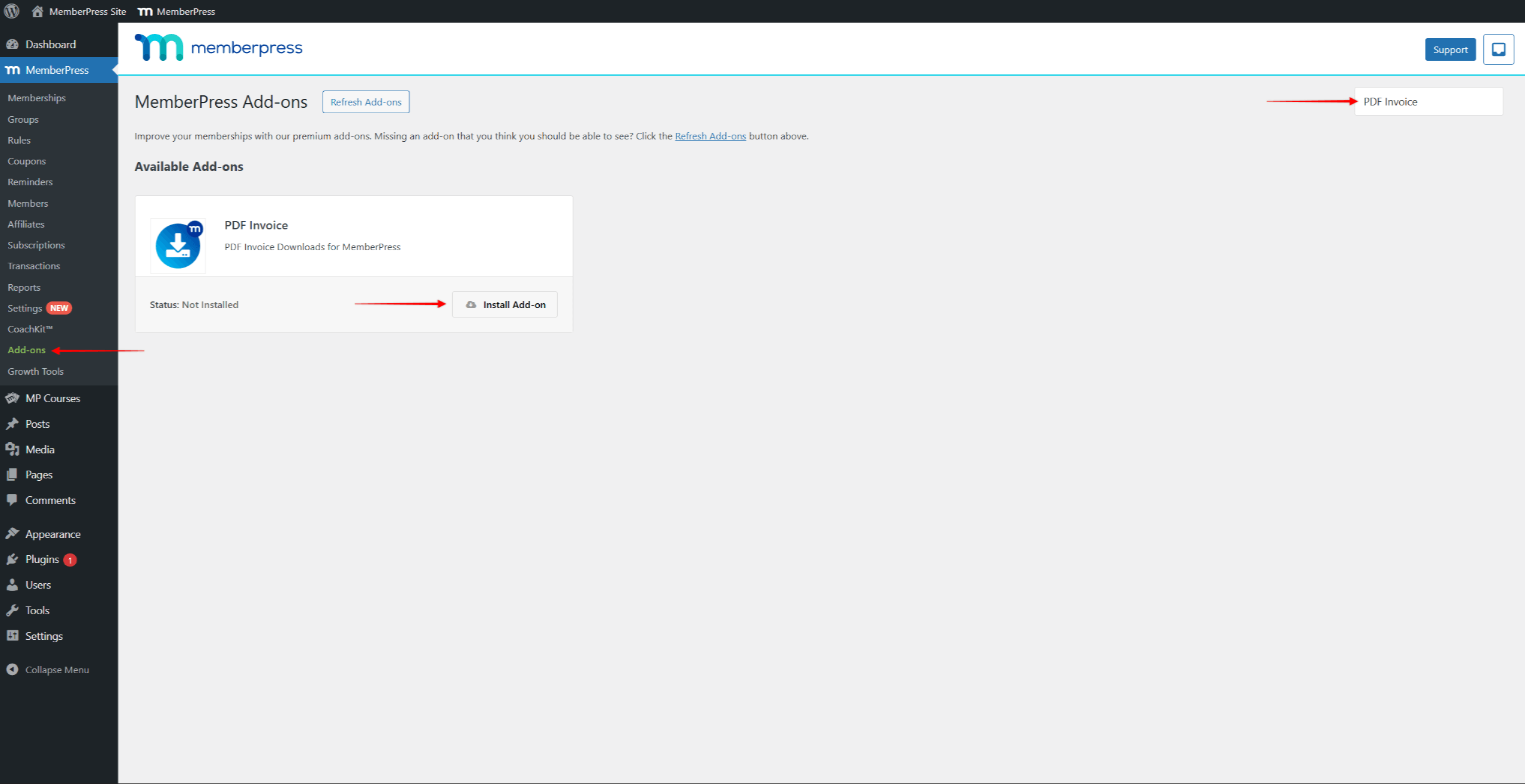 - Navigate to Dashboard > MemberPress > Add-ons.