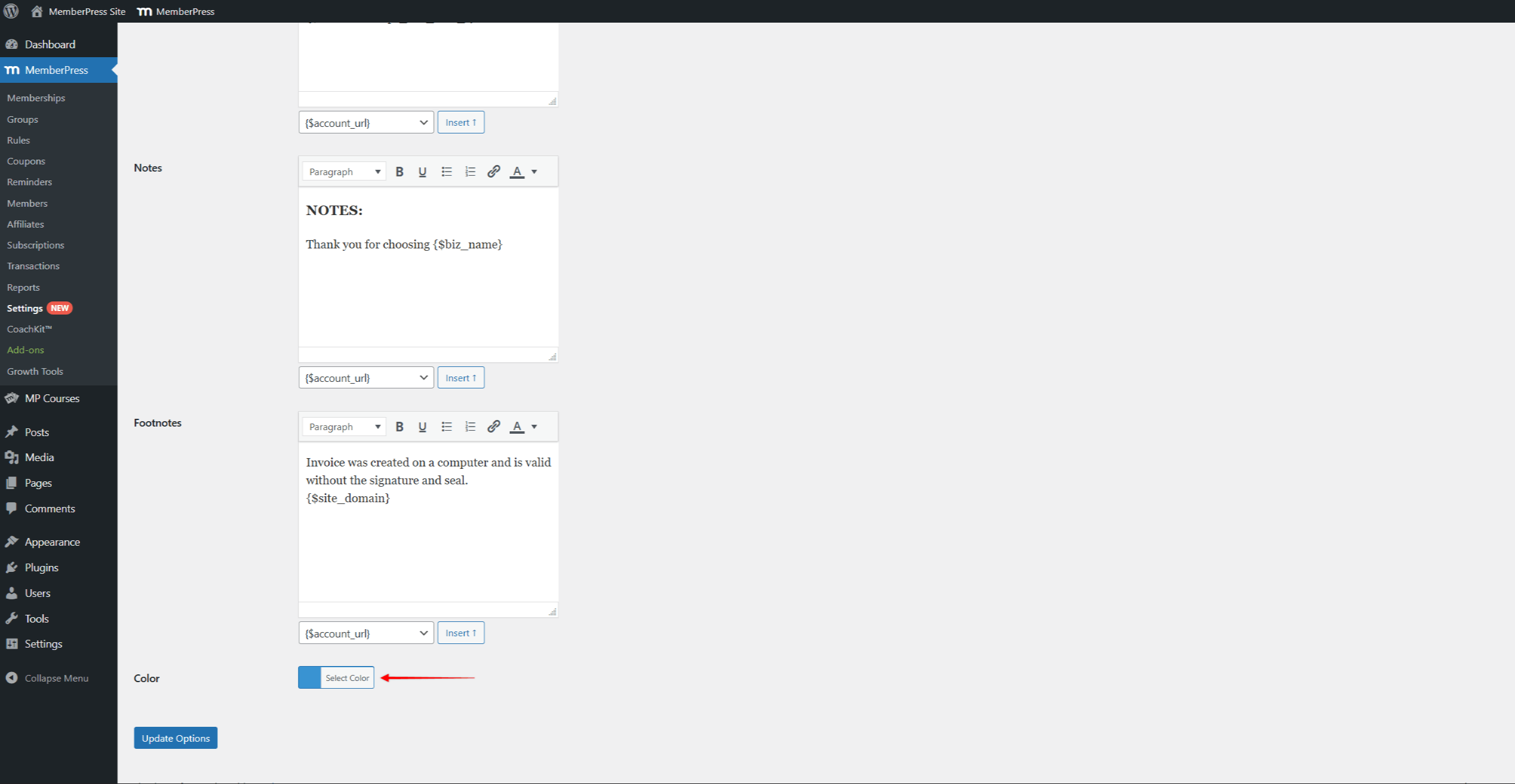Furthermore, MemberPress invoices are styled using one base color. To change the default color, scroll down to the Color option and pick a color.