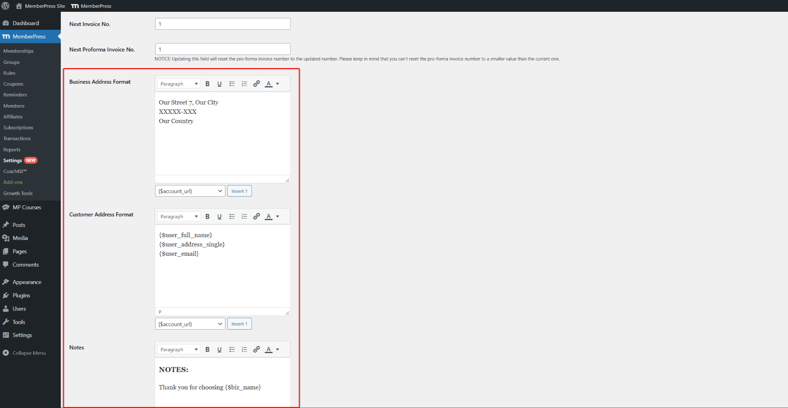 Here, for each available area, you can type any text you wish to add to invoices using the text editor. Also, you can add other existing data from MemberPress by inserting additional parameters.