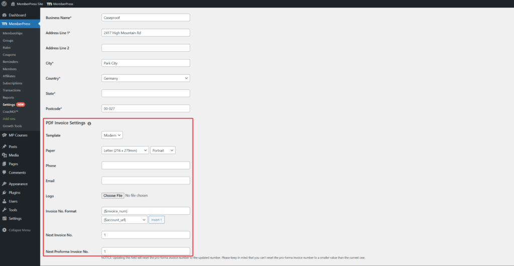 Following the add-on activation, you need to configure invoices and pro-forma invoices for them to be generated for MemberPress transactions.